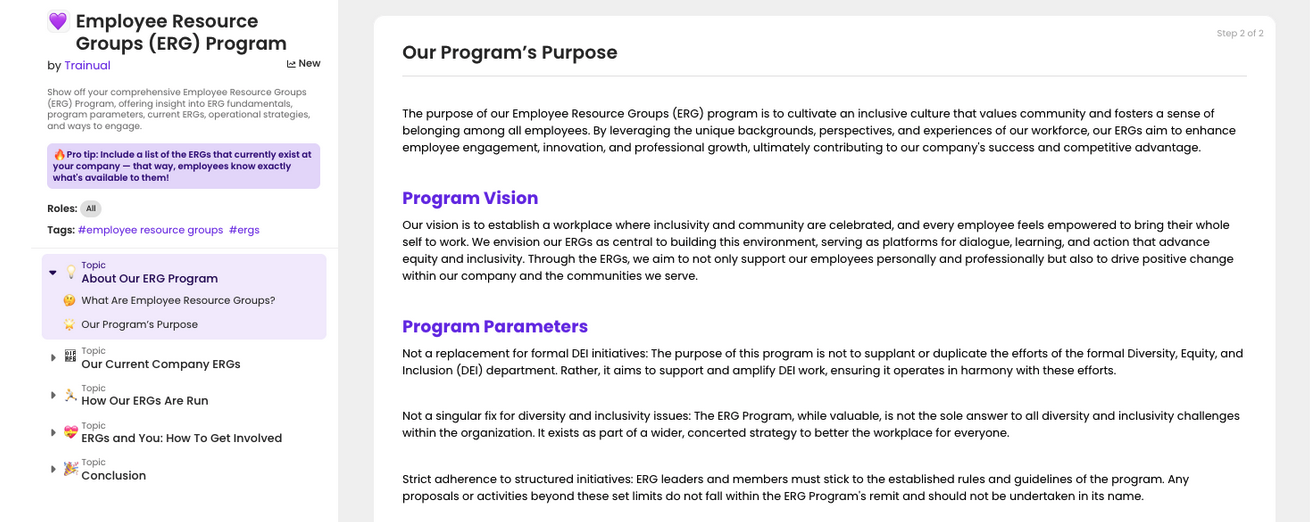 👉 How to get it in Trainual: Add the Employee Resource Groups (ERG) Program template to your account, customize it to fit your business’ unique needs, and share it with your team!