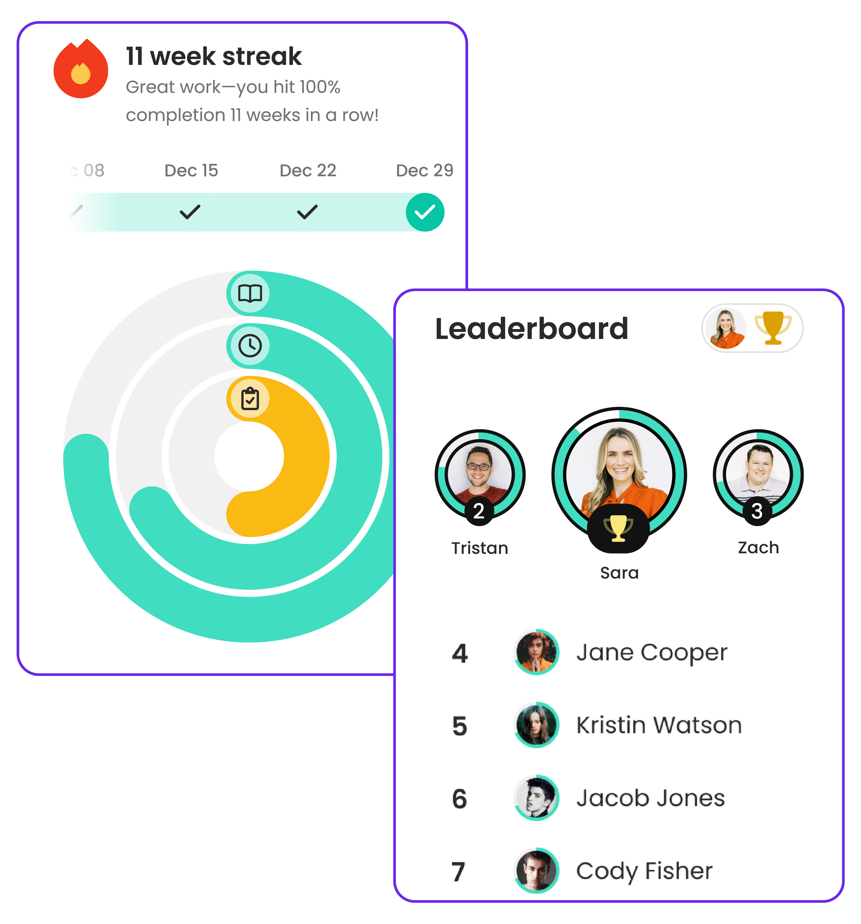 As you stay on top of your training each week, your streak climbs higher โ showing off just how consistent youโve been. Plus, you can see where you (and your peers) stand on the company leaderboard.