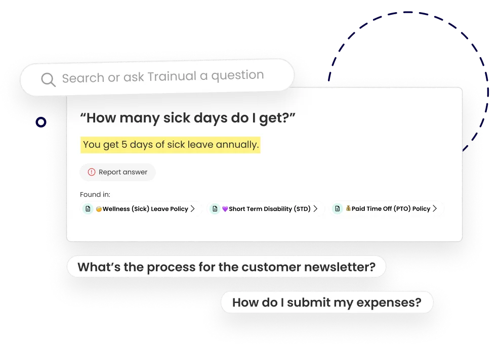 No more dealing with the same repetitive questions. Ask Trainual, and our AI-powered search bar will surface an answer straight from the content in your account.