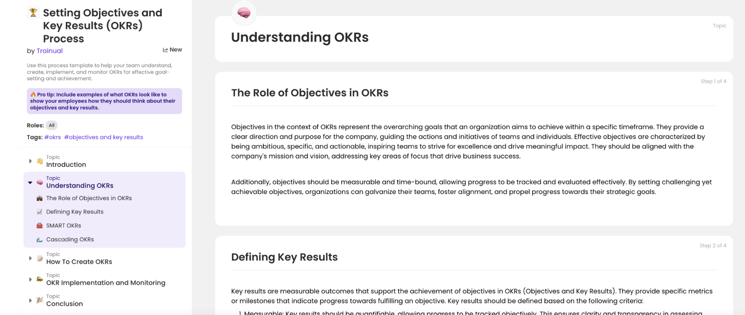 👉 Enter the Setting Objectives and Key Results (OKRs) Process template. With a step-by-step guide and fully-fledged examples, your team will have no questions about how to successfully create OKRs. All it needs is your personal touch, and it’s ready to train your team!